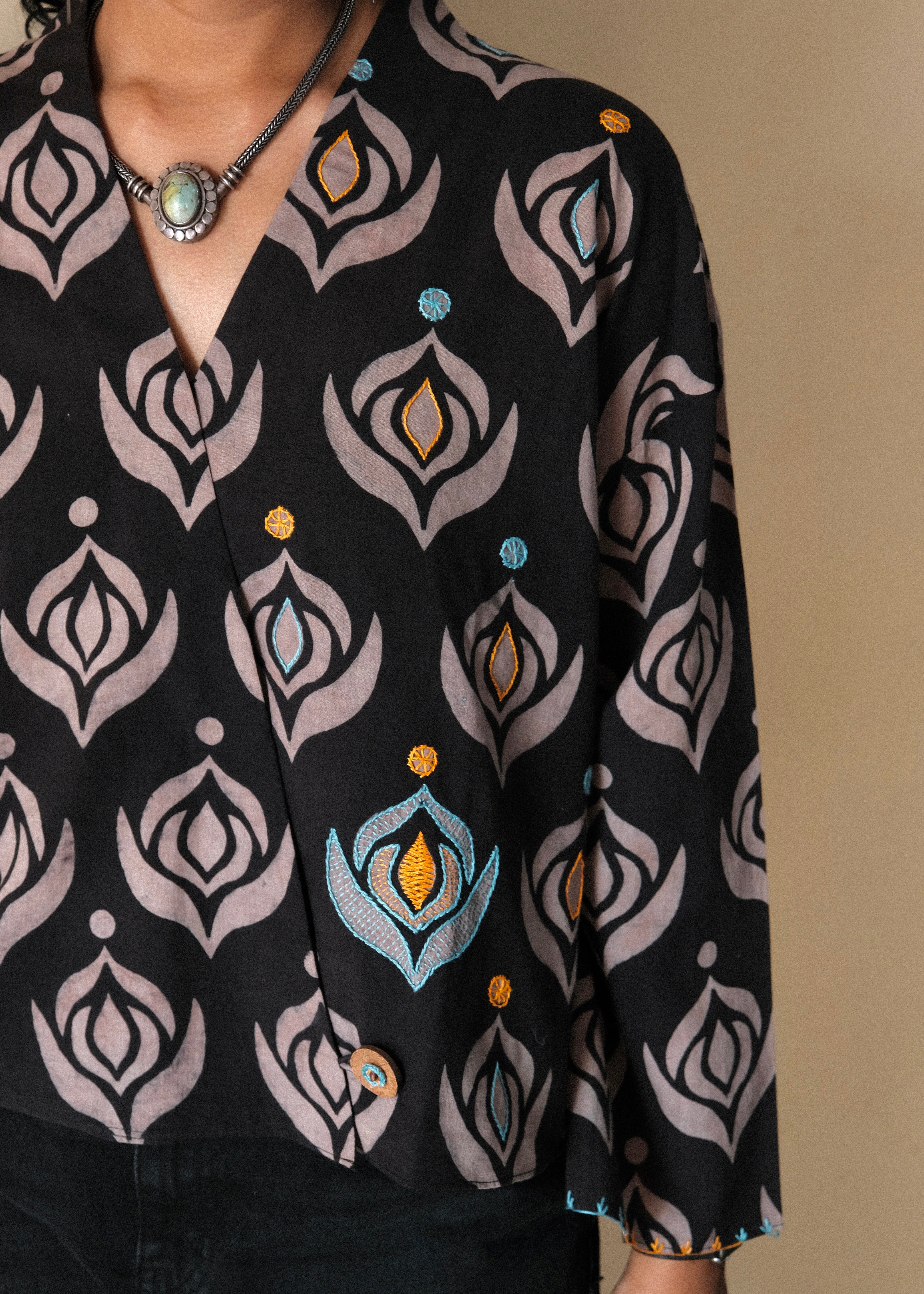 - Kimono style top in soft ajrakh printed cotton - Artisanal hand embroidery highlights in contrast colours...