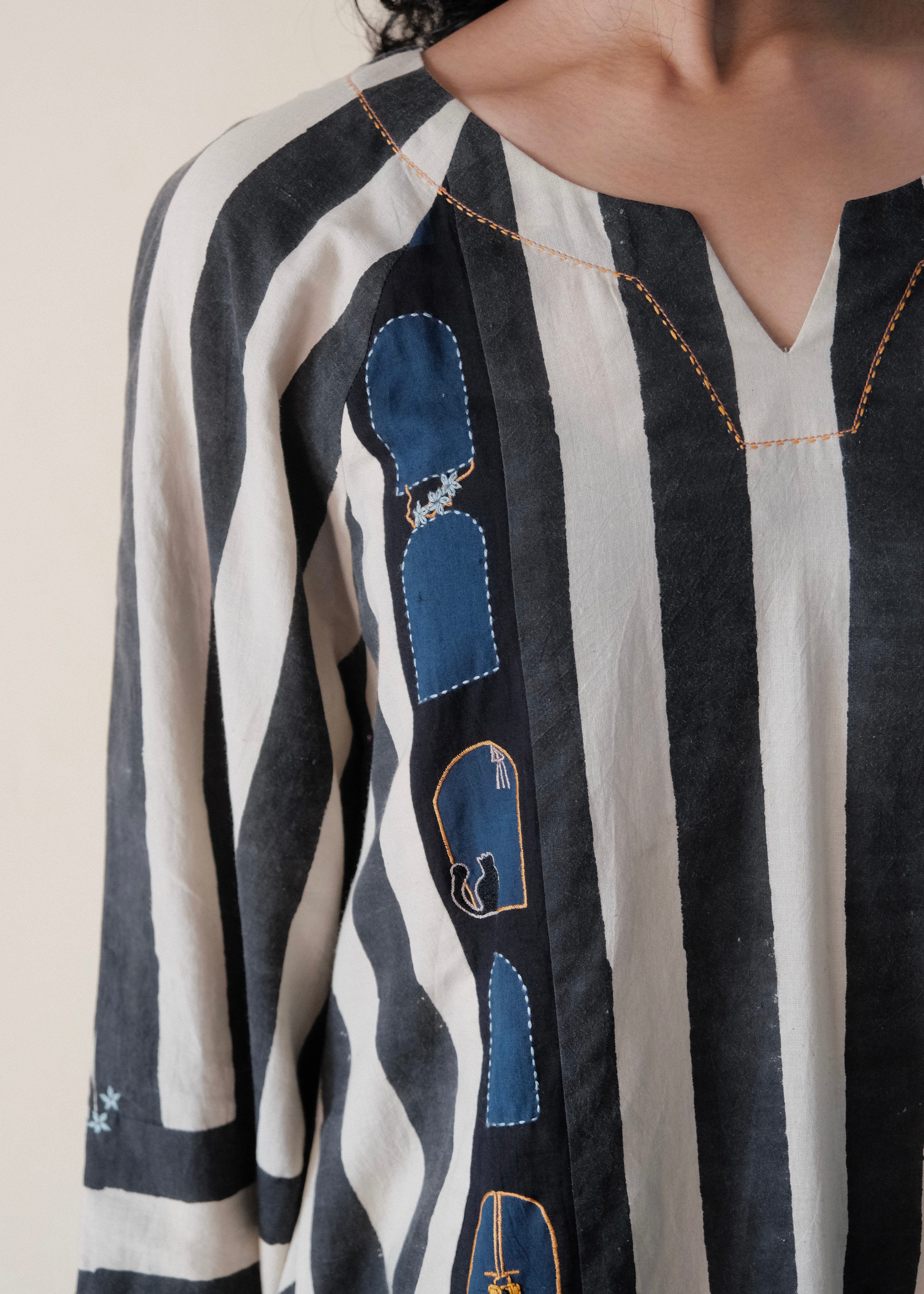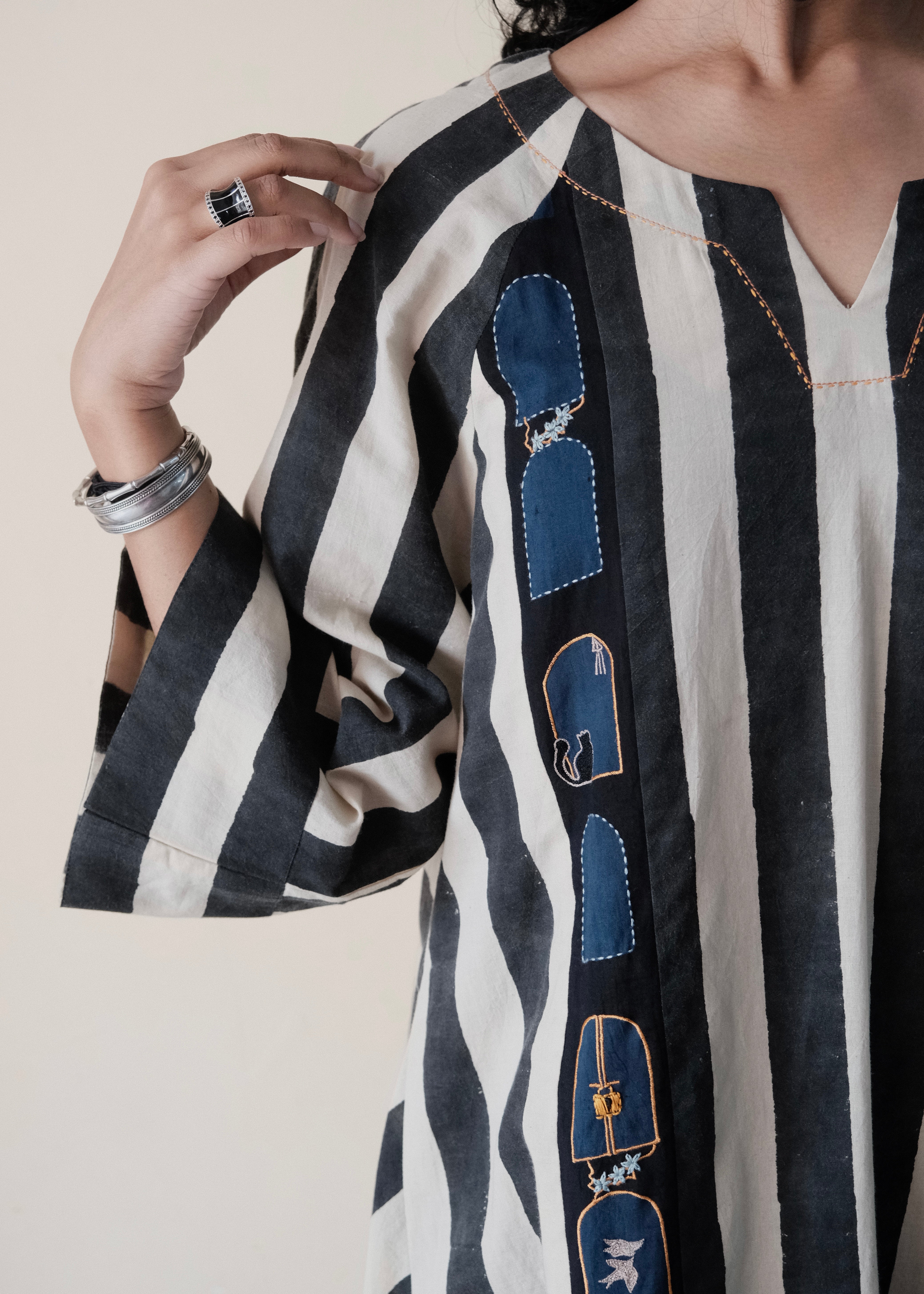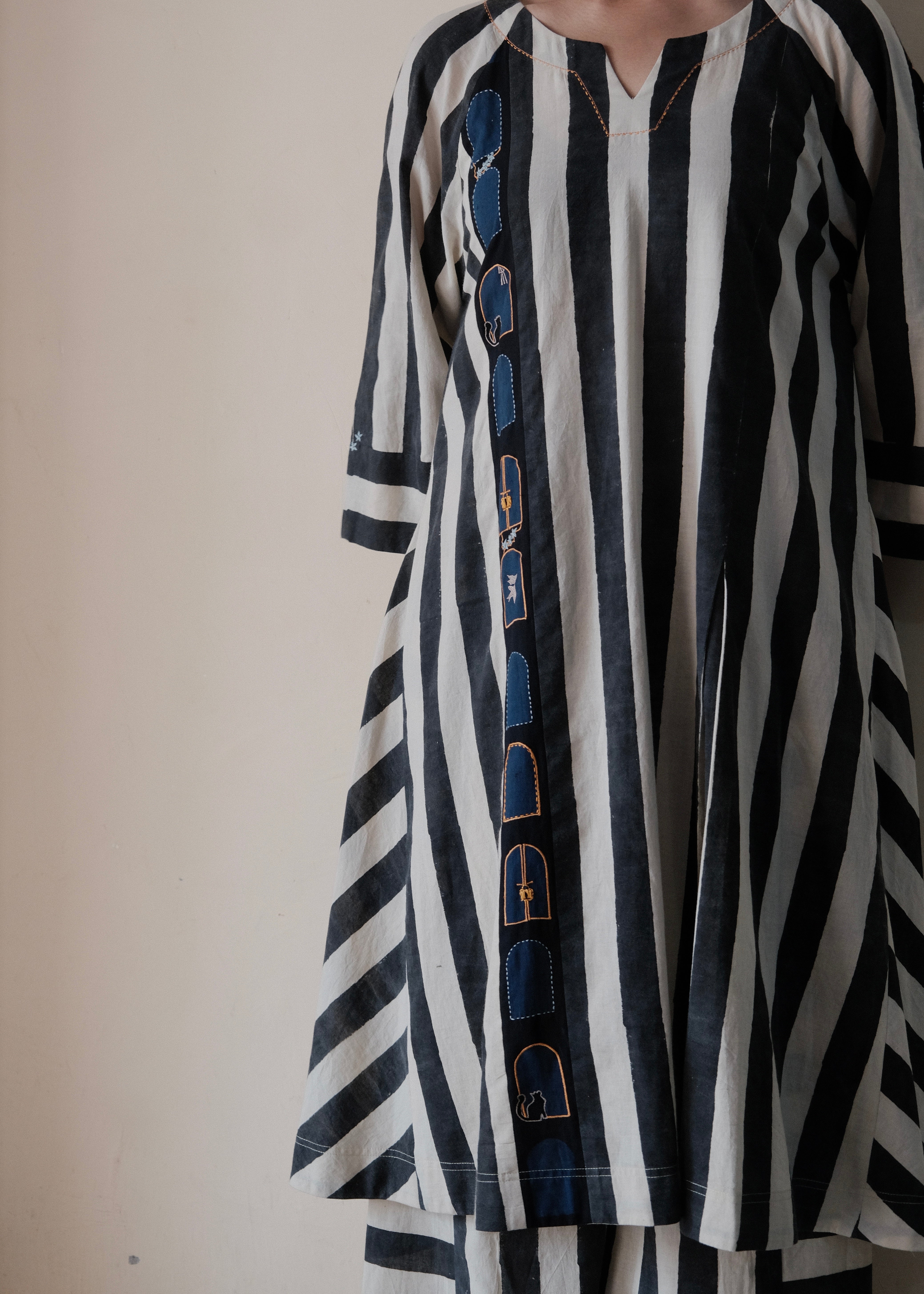 - Multi panelled flowy kurta with bias side panels and raglan sleeves - Interesting juxtaposition of stripes...