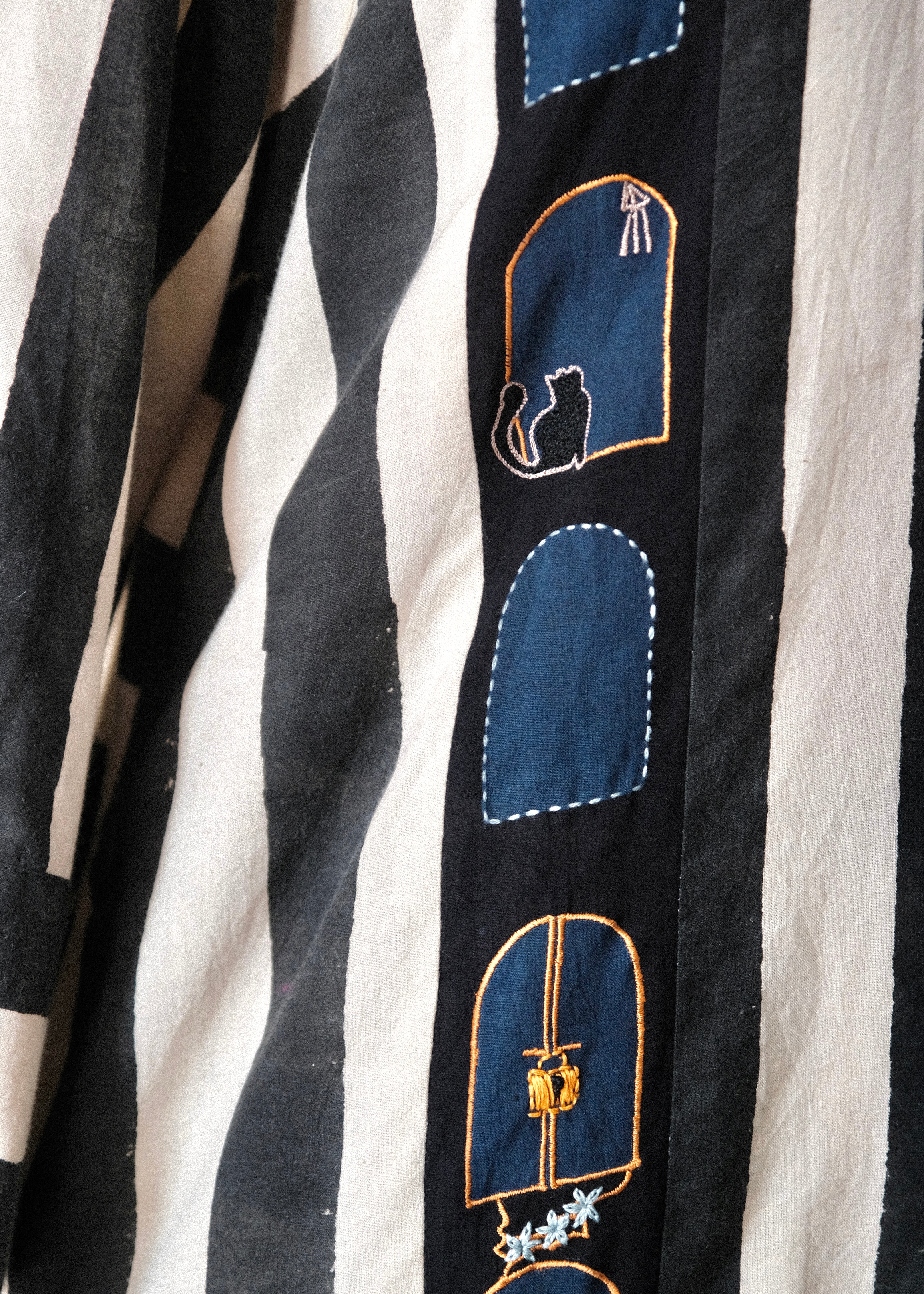 Black cream ajrakh striped print anti fit co ord set with window detail