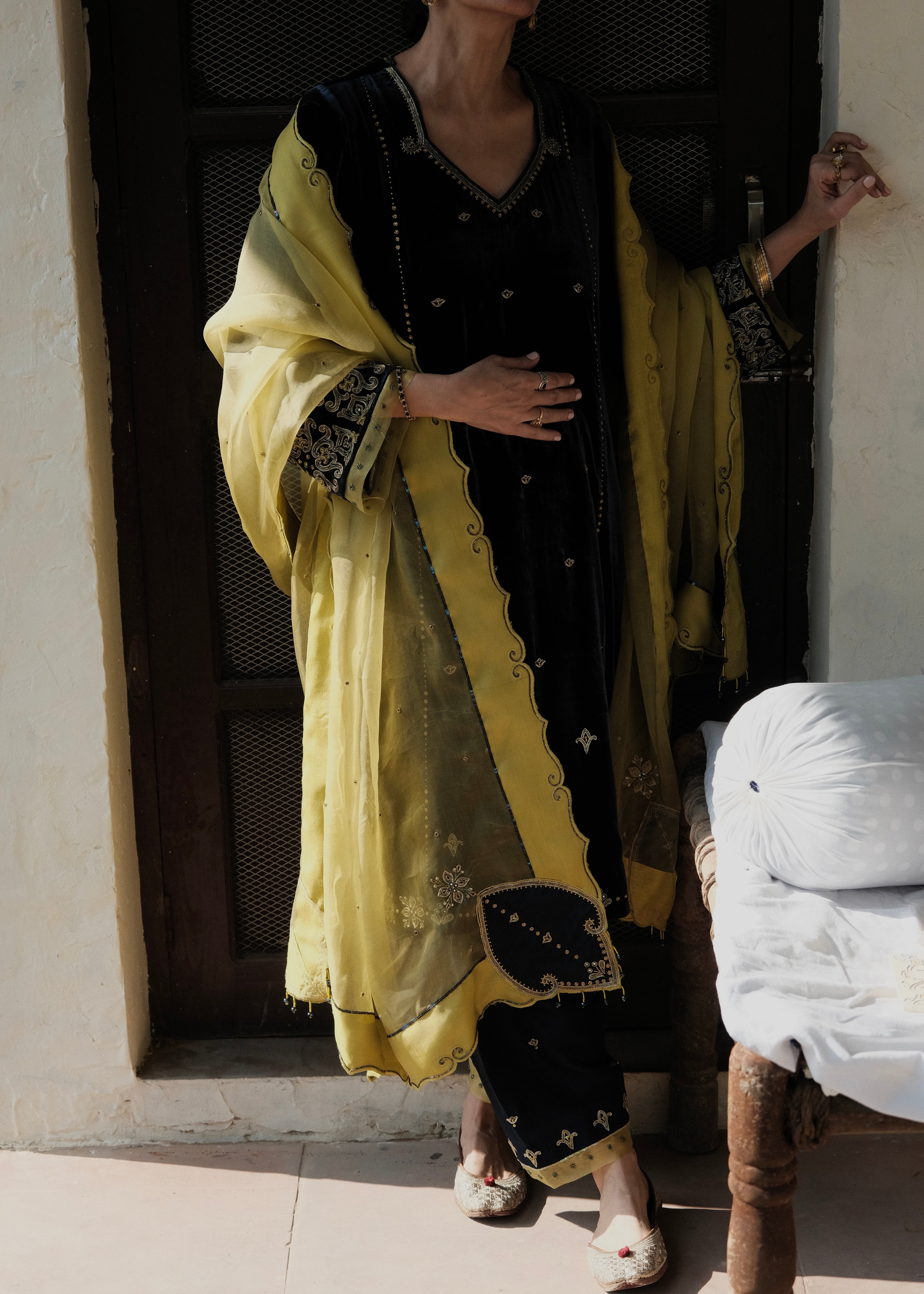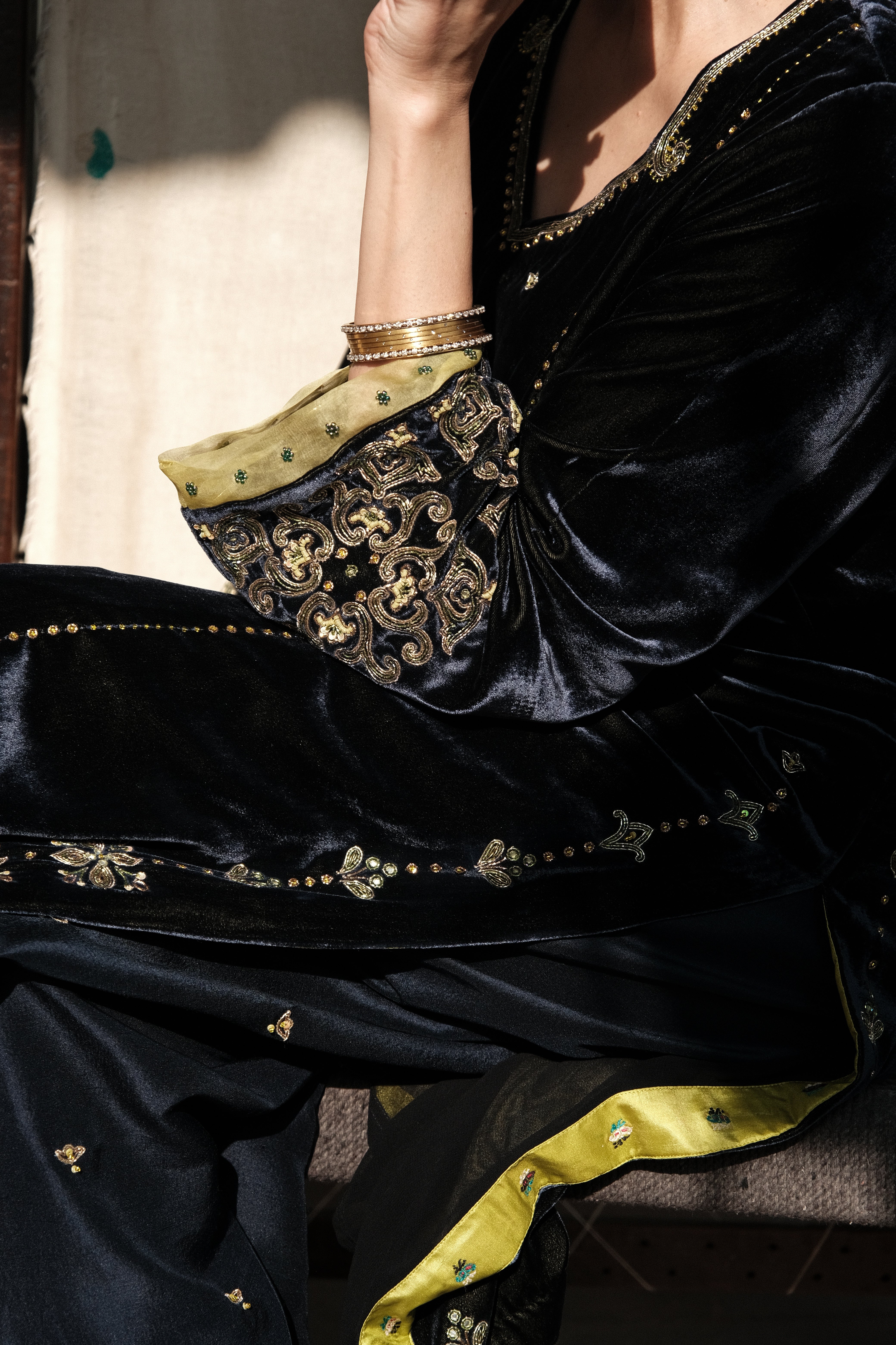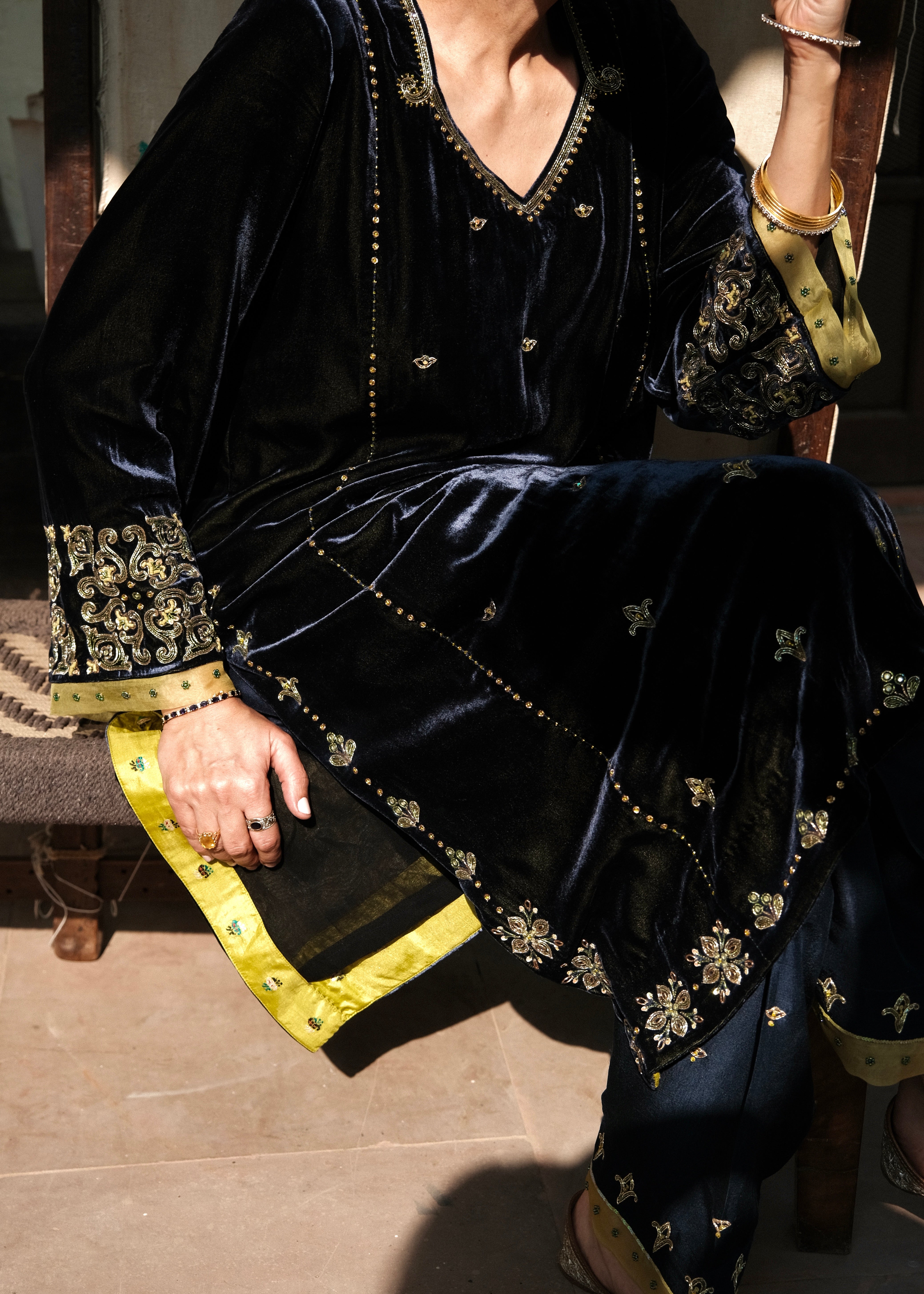 Discover this navy–green velvet kurta set with tile-inspired hand embroidery, geometric sleeve motifs, and a silk salwar accented with bootis. The contrast lime organza dupatta features scalloped tile borders, appliqué corners, and beaded latkans. A luxurious handcrafted outfit ideal for weddings, festive wear, and winter celebrations.