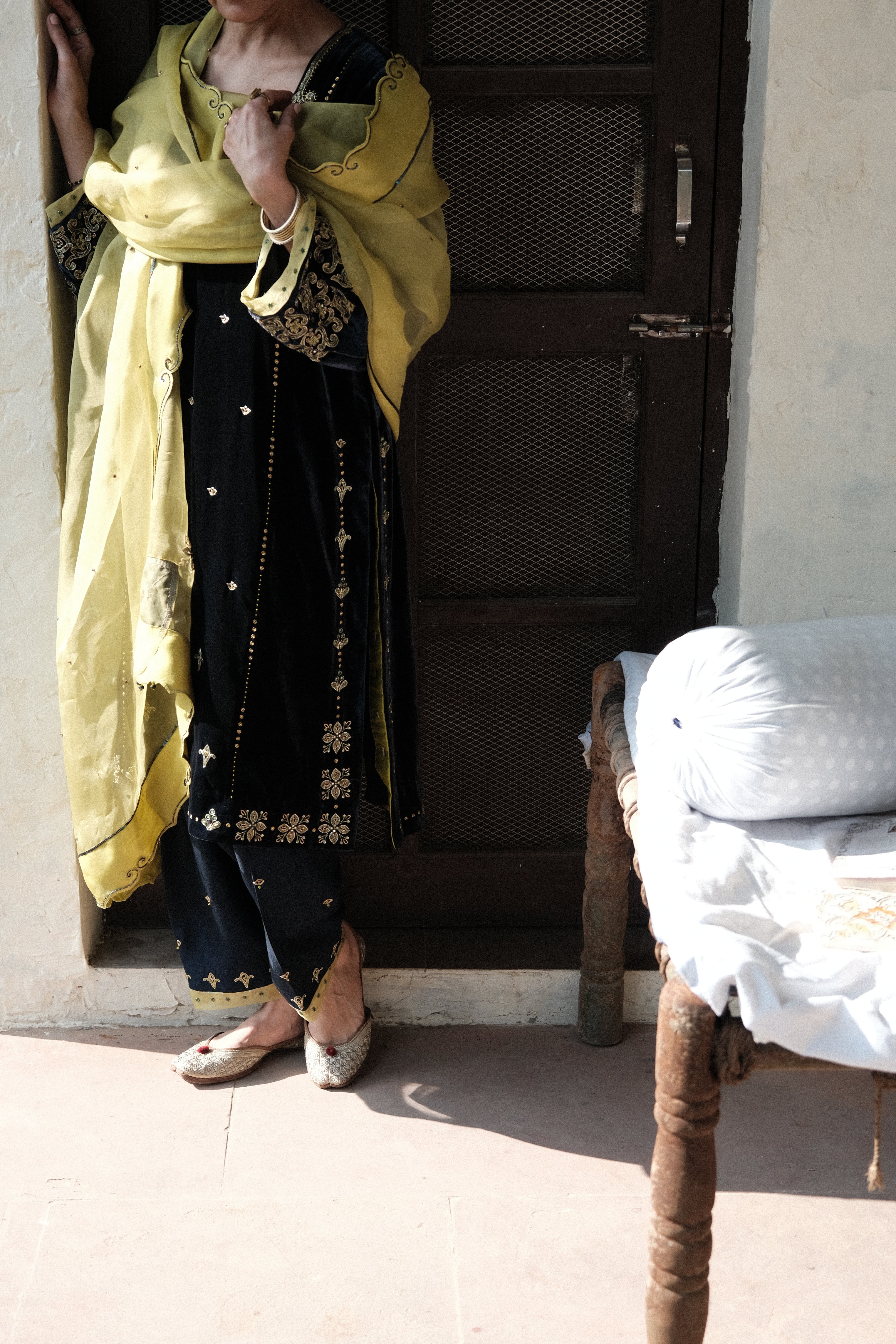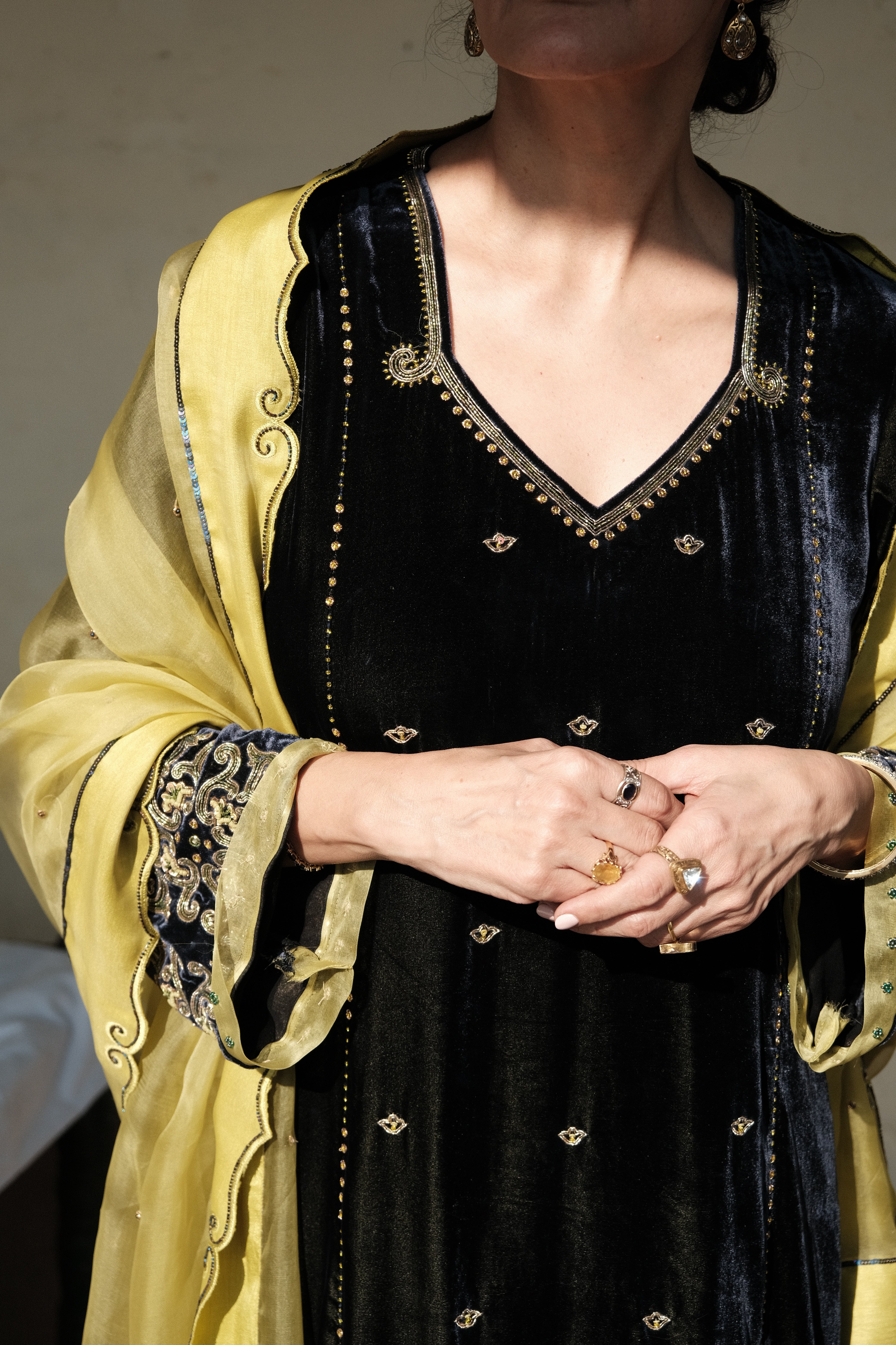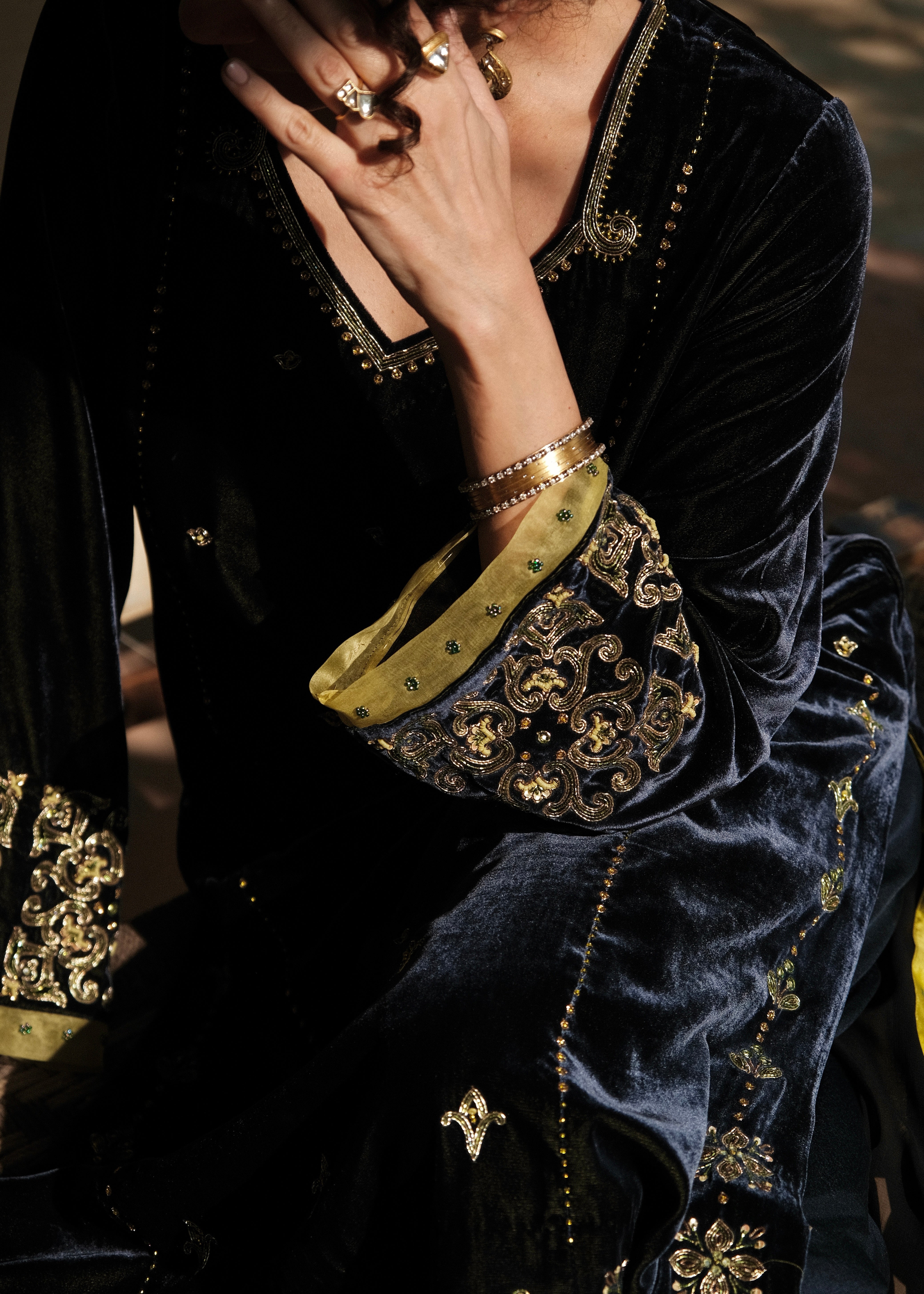 Discover this navy–green velvet kurta set with tile-inspired hand embroidery, geometric sleeve motifs, and a silk salwar accented with bootis. The contrast lime organza dupatta features scalloped tile borders, appliqué corners, and beaded latkans. A luxurious handcrafted outfit ideal for weddings, festive wear, and winter celebrations.