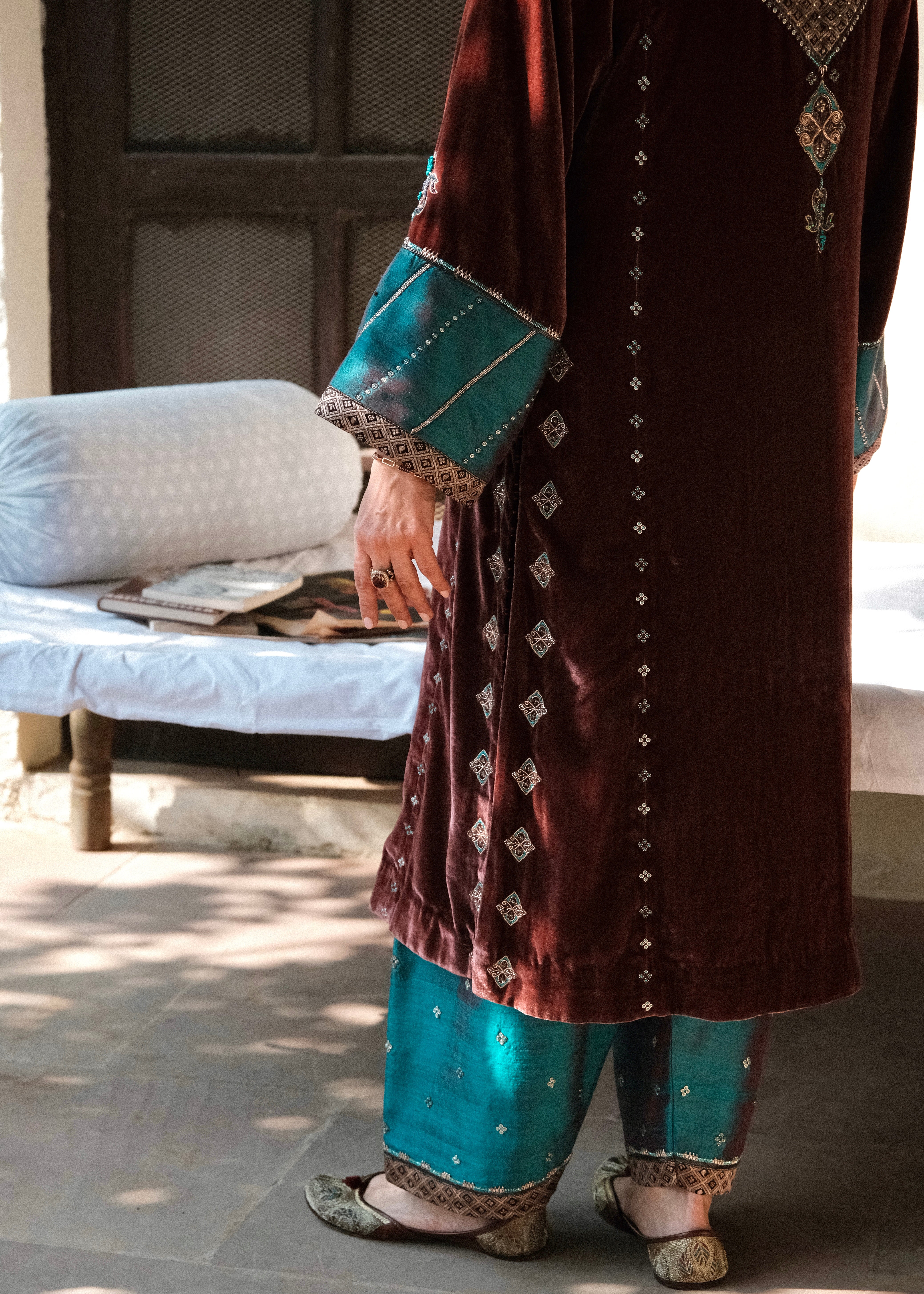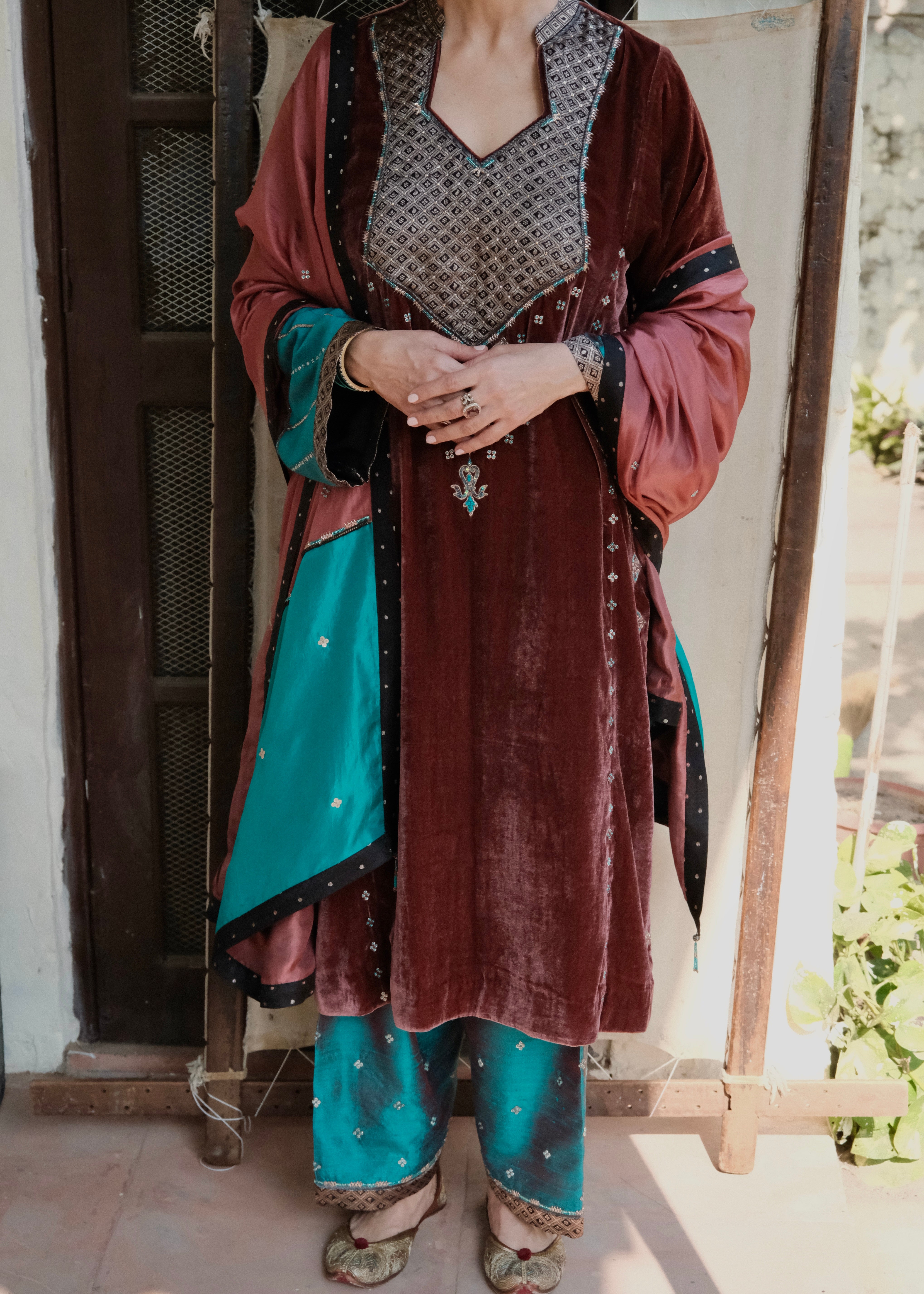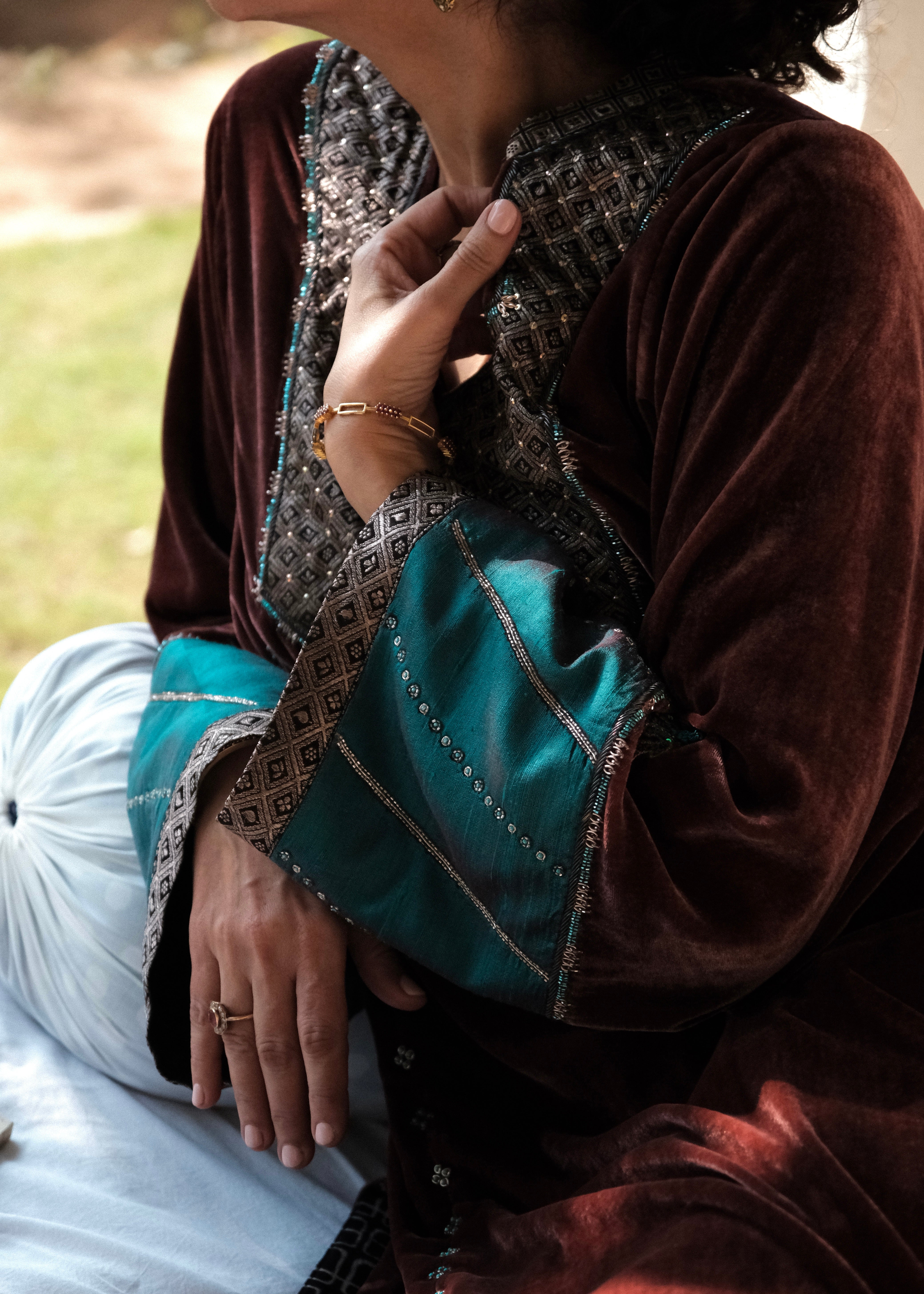 A rich marsala velvet ensemble inspired by the geometry and nostalgia of old-world mosaics. Intricately handcrafted details meet luxurious textiles for a silhouette that feels both regal and quietly modern.