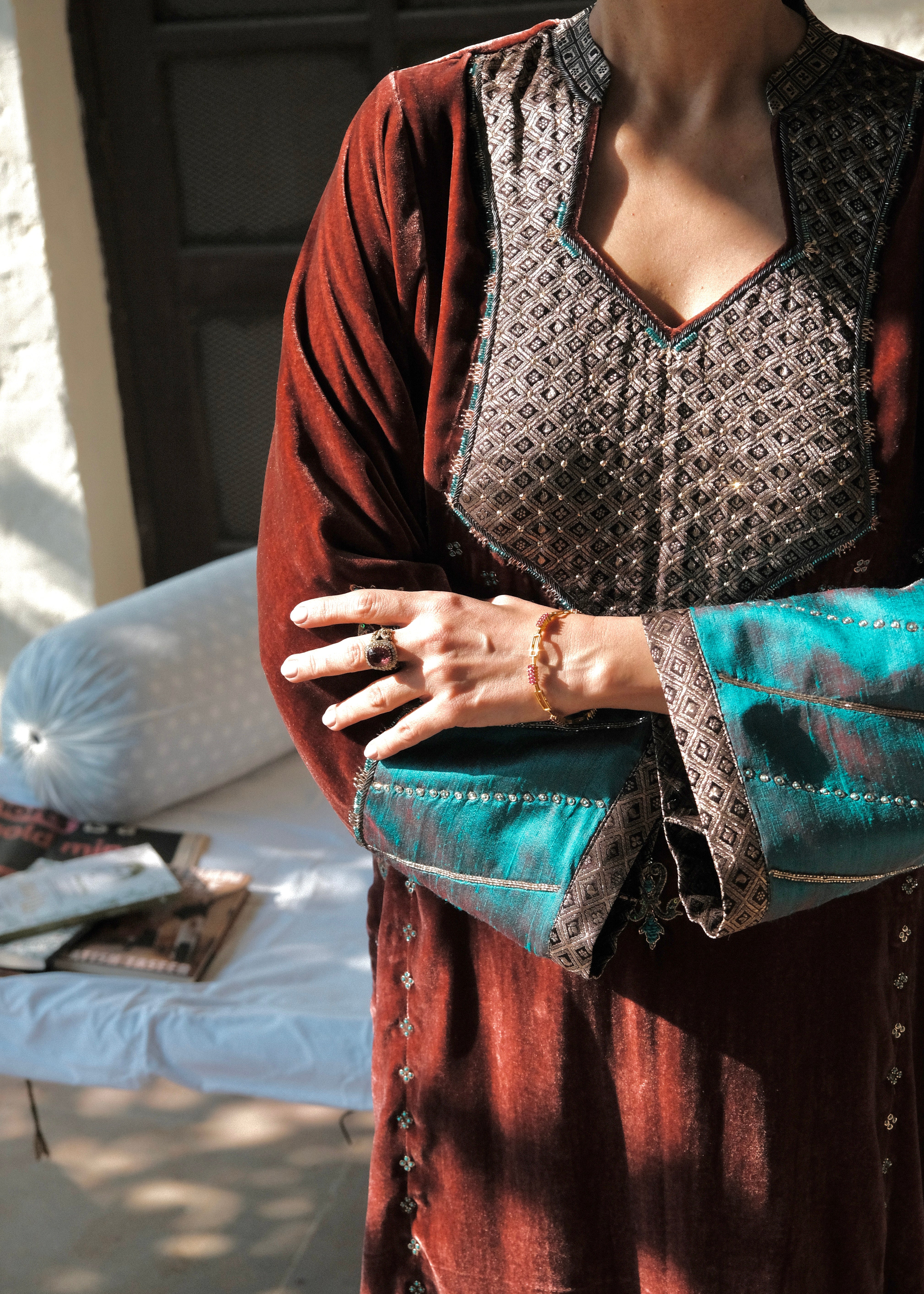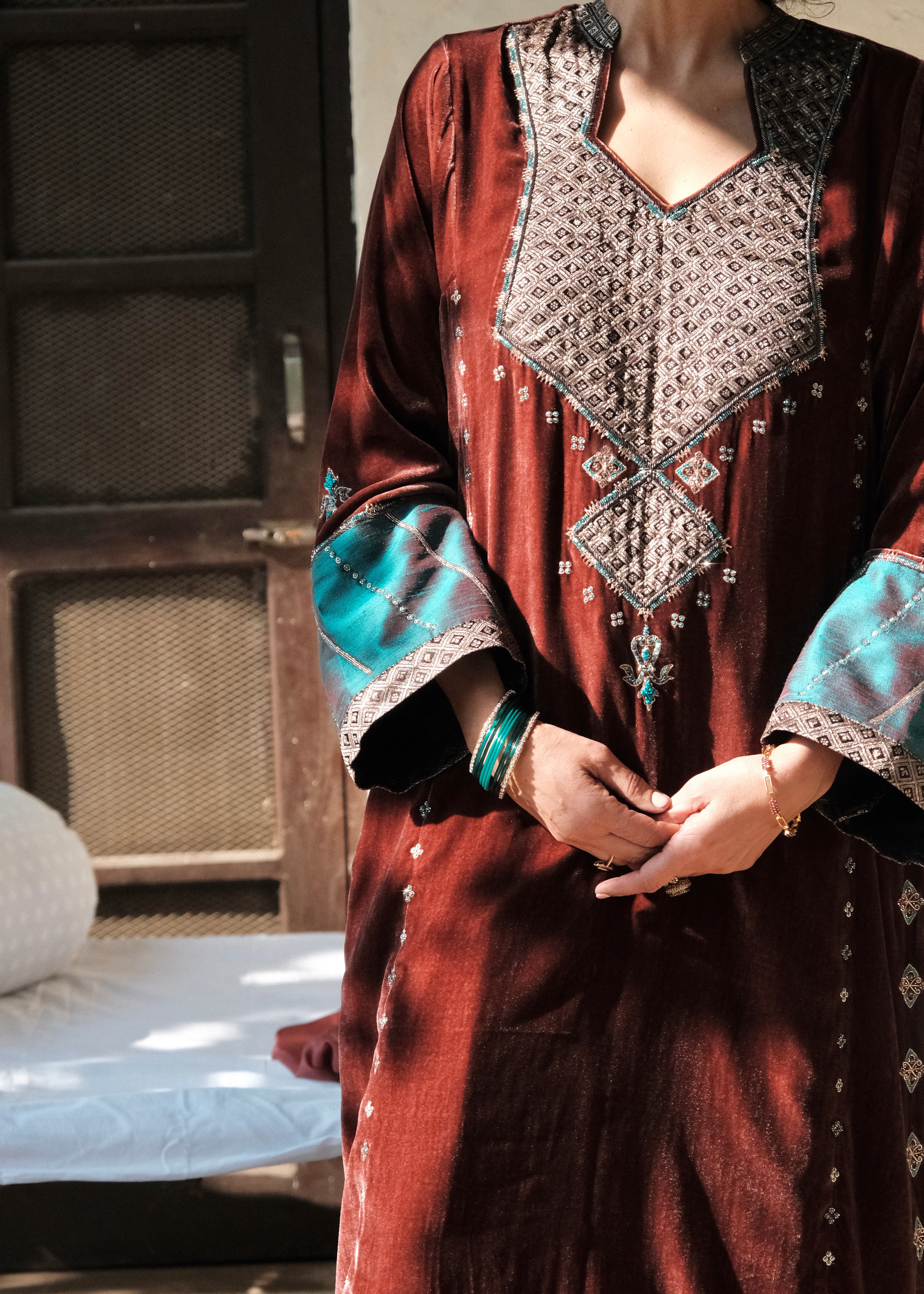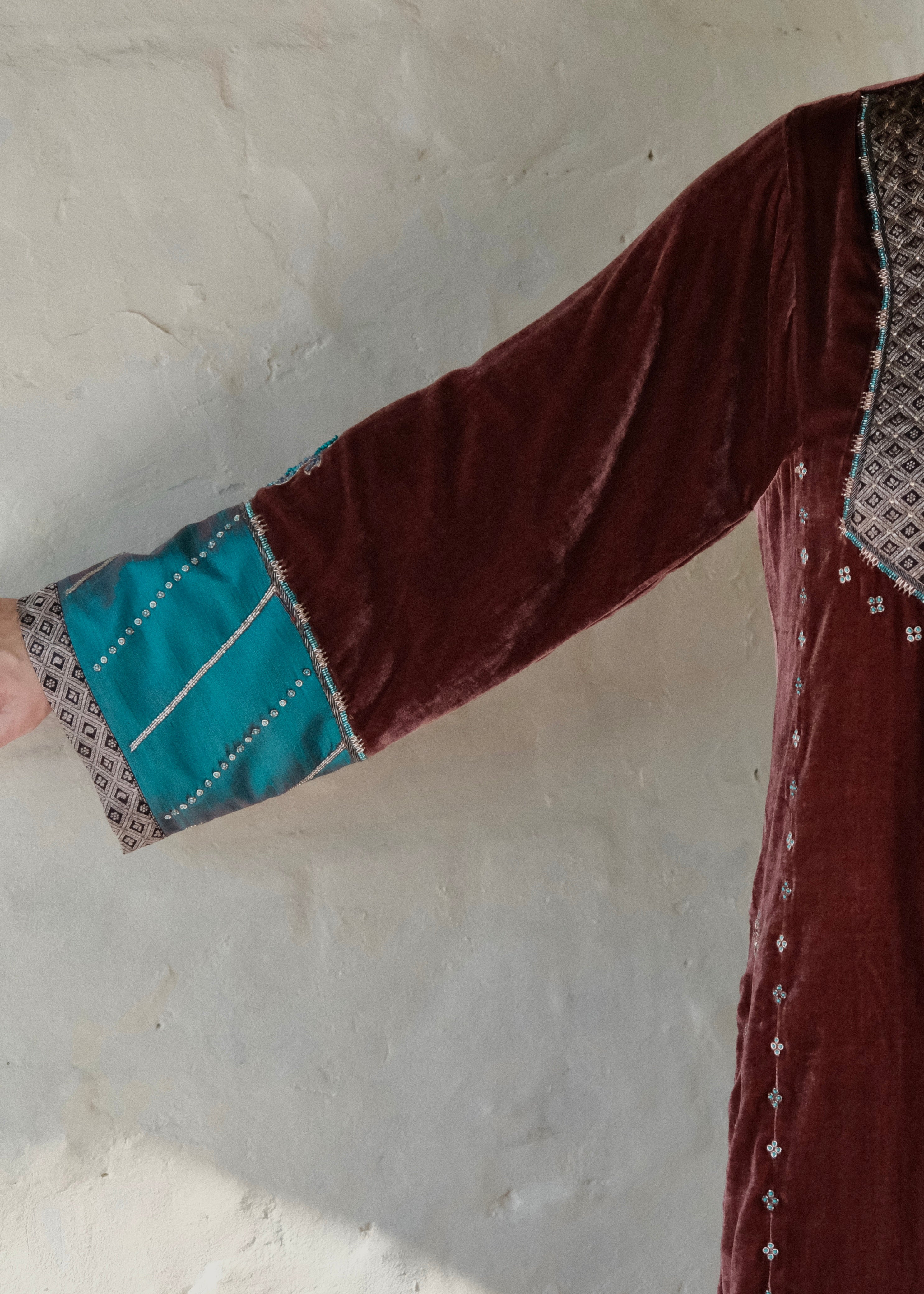 A rich marsala velvet ensemble inspired by the geometry and nostalgia of old-world mosaics. Intricately handcrafted details meet luxurious textiles for a silhouette that feels both regal and quietly modern.