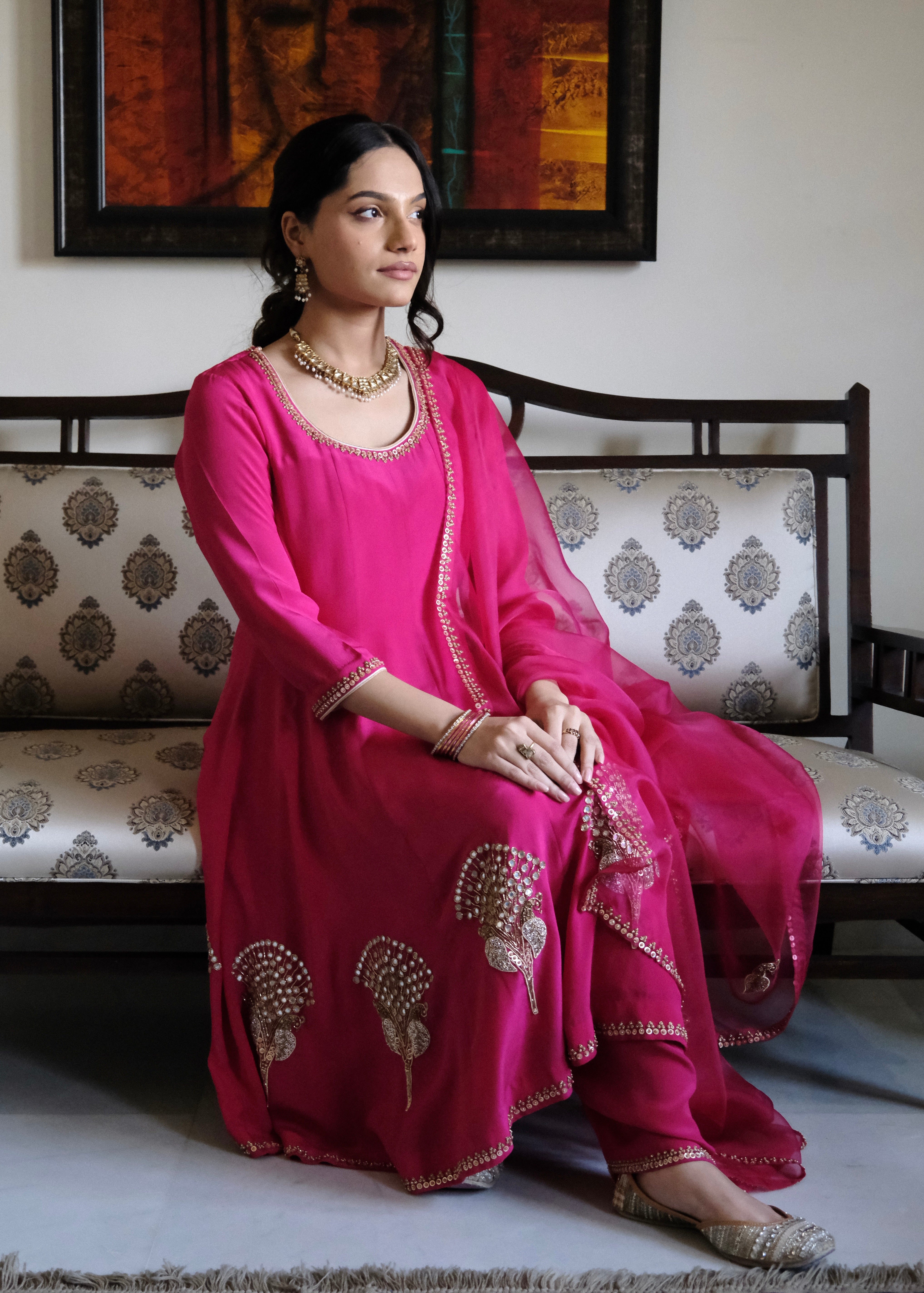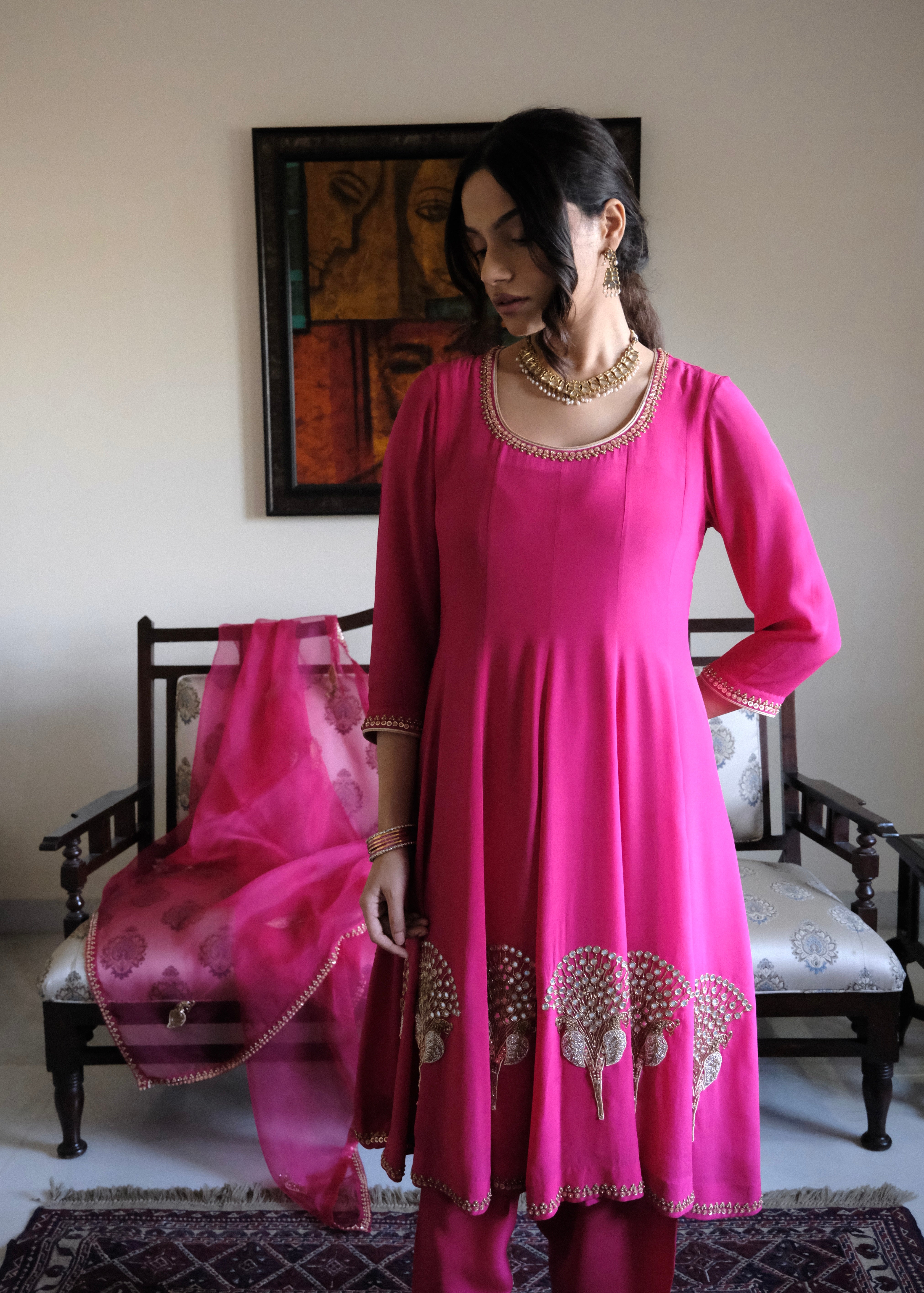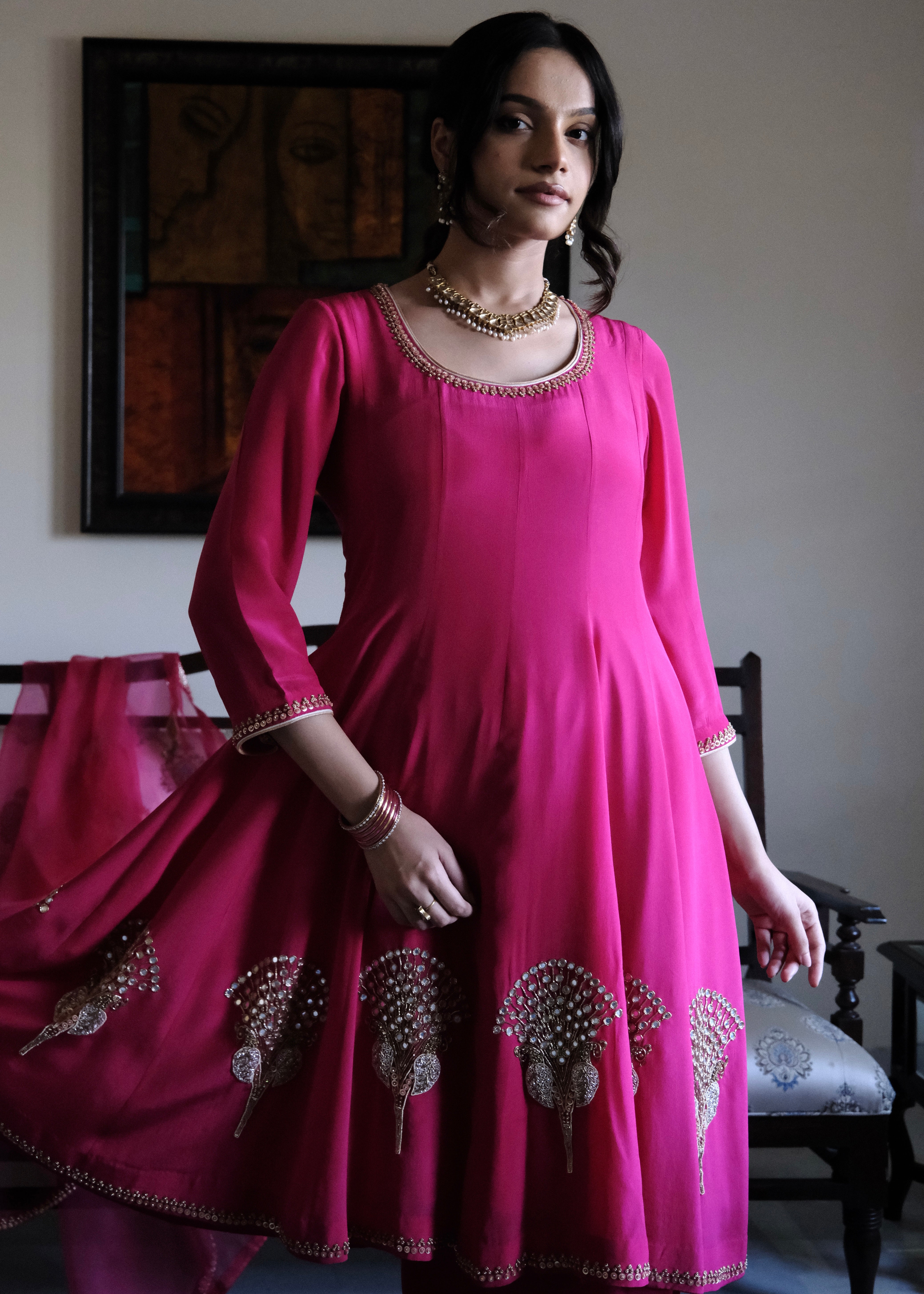 - Rani pink georgette anarkali kurta with striking hand worked peacock motifs in dabka, naqshi, tilla and mirrors