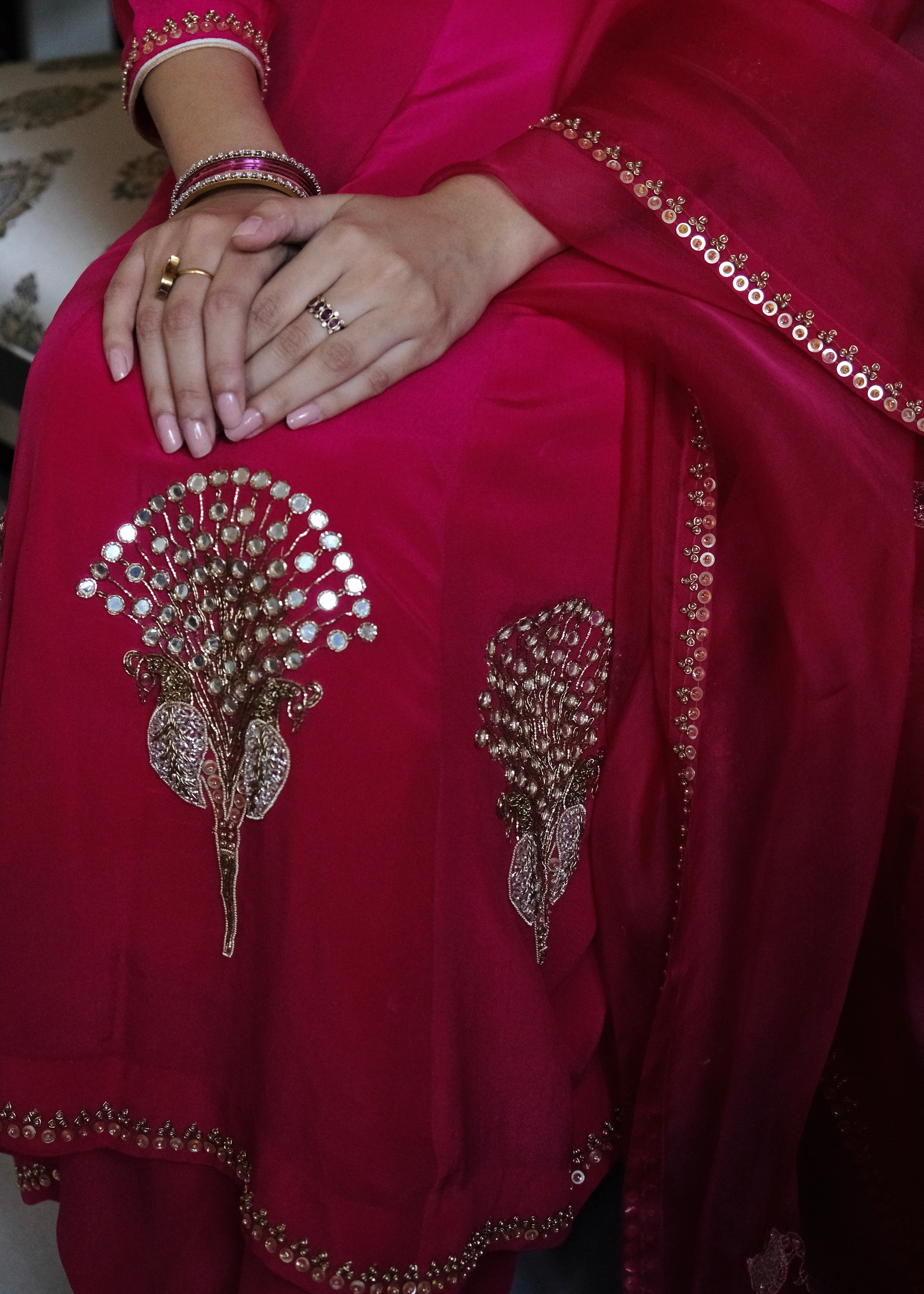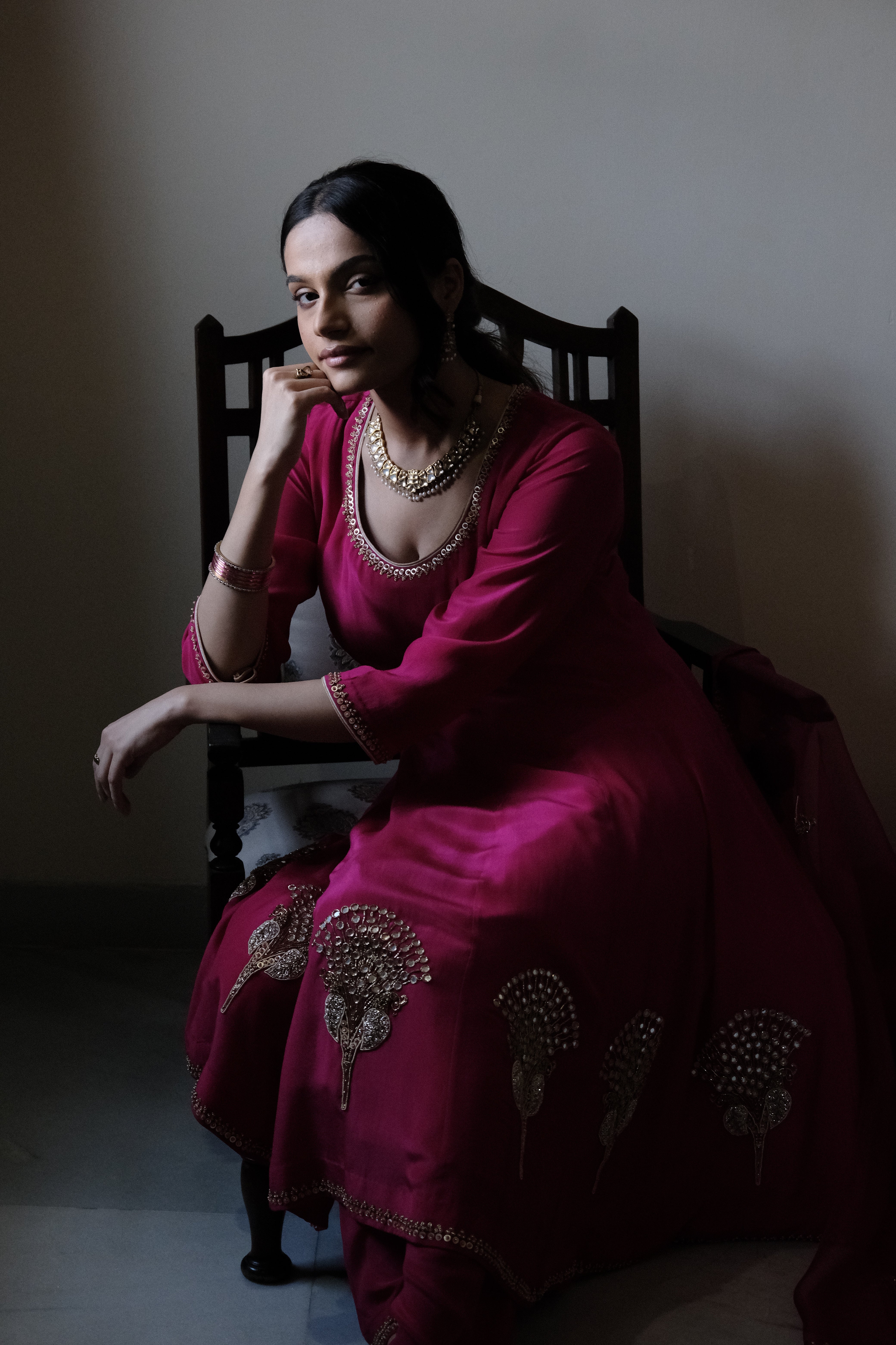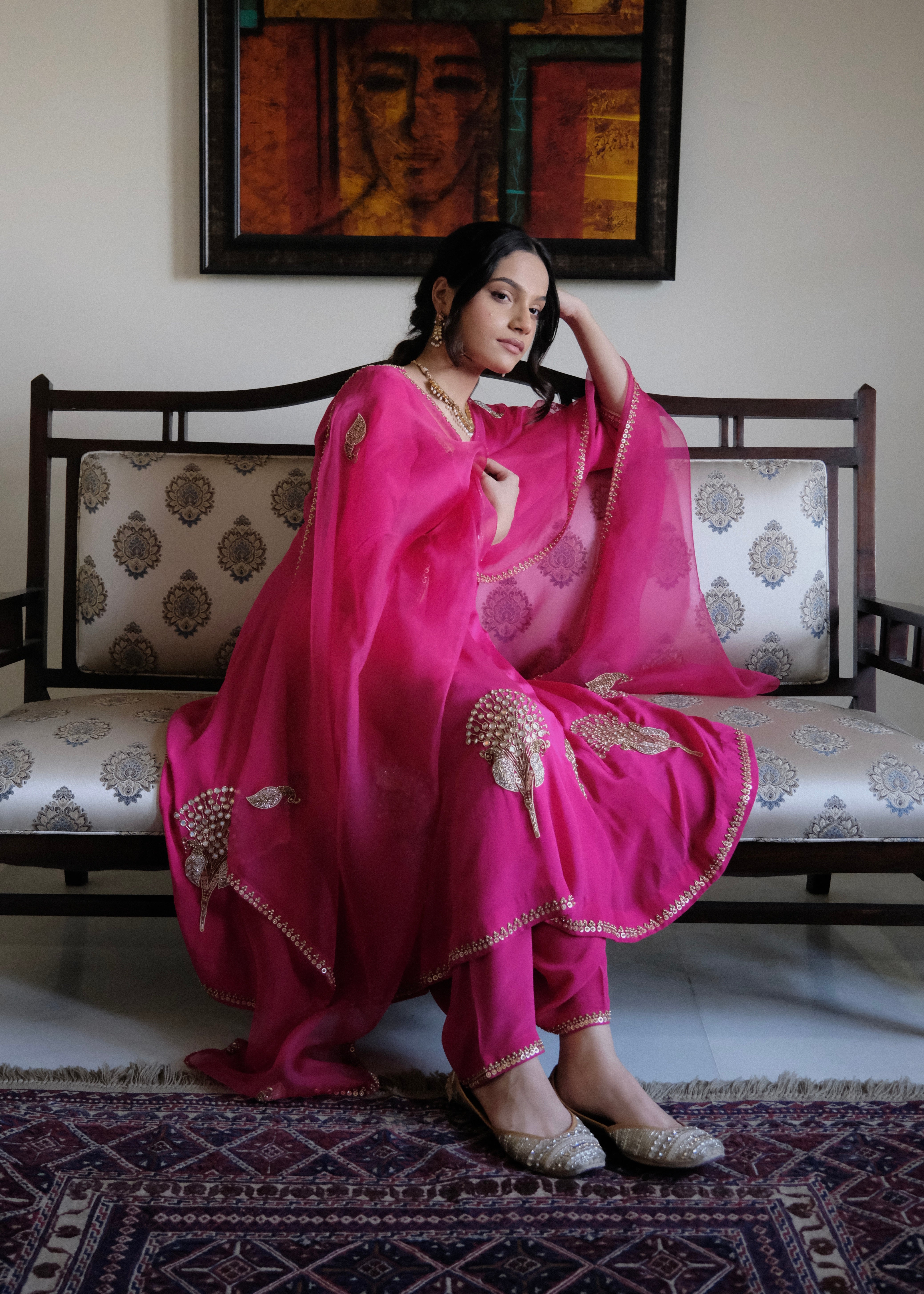 - Rani pink georgette anarkali kurta with striking hand worked peacock motifs in dabka, naqshi, tilla and mirrors